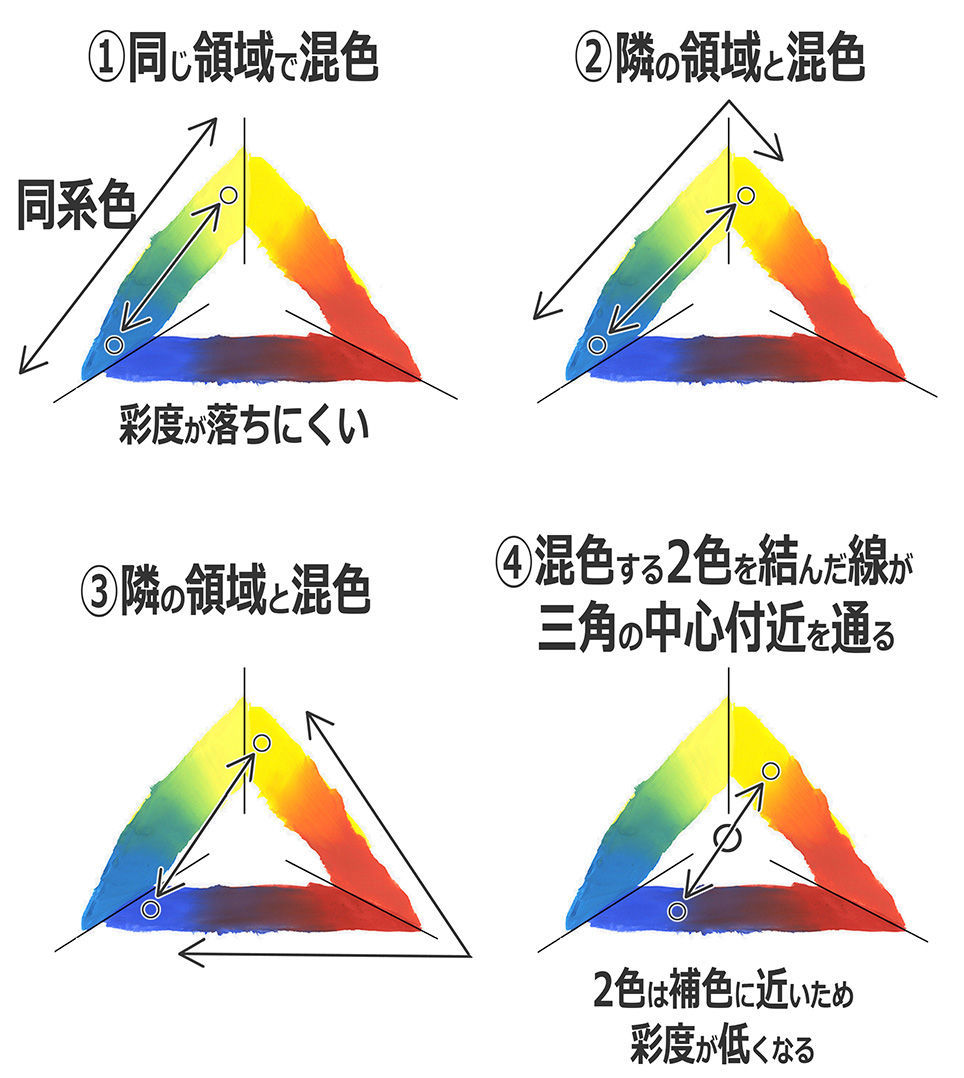 ②~④のように隣の領域と混色すれば彩度を落とすことができます