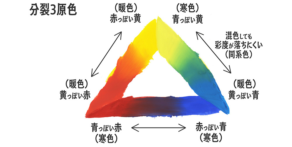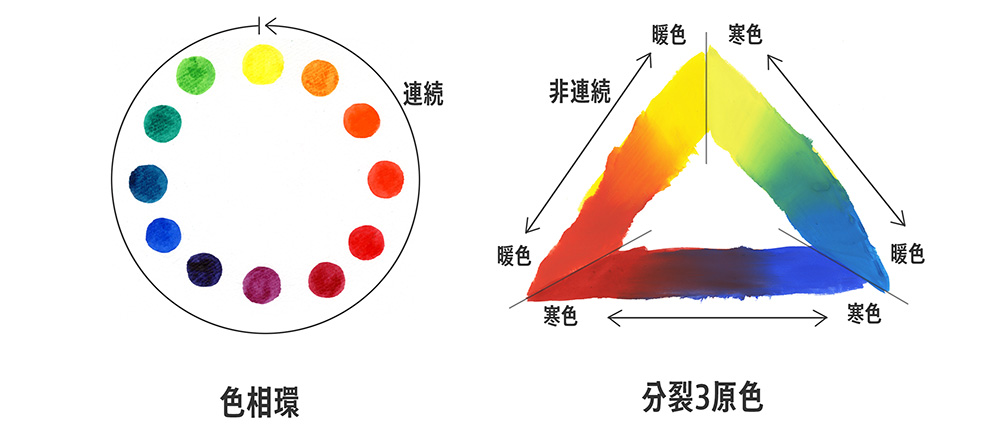「分裂3原色:色相を寒色/暖色で区別」「色相環:色相が連続」